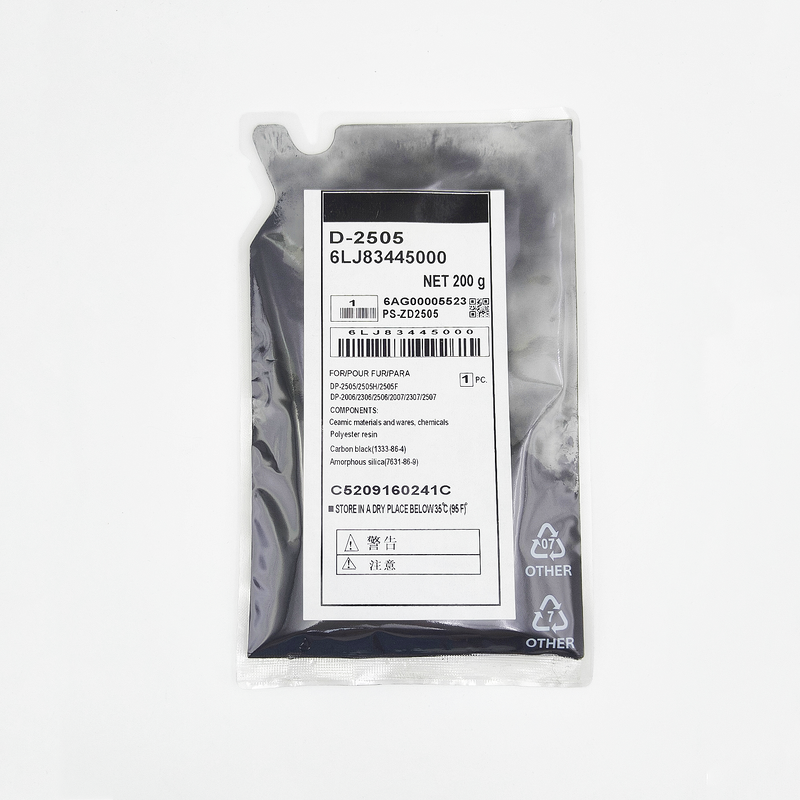 We manufacture strict D-5070 powder which follows exact triboelectric properties specified by factory standards, producing black text, crisp edges, and the full density required by the printer. Toner does not "dust" or scatter.